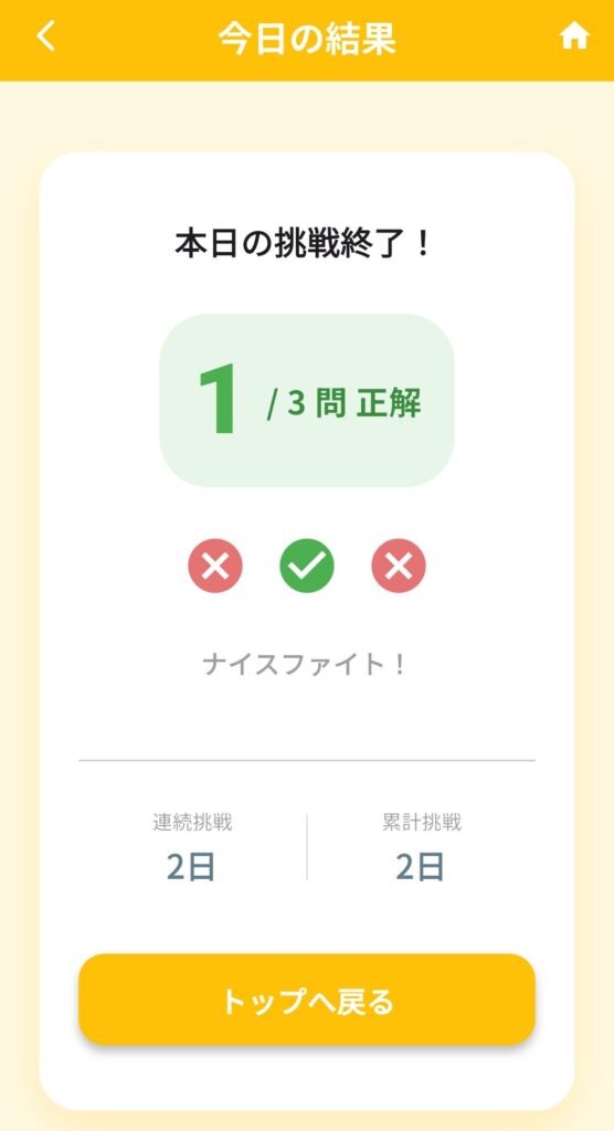 トップ画面で「今日の3問を始める」ボタンを押すと、毎日配信される3問に挑戦できます。