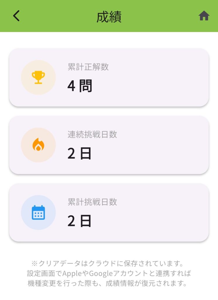 - 連続挑戦日数や累計継続日数などが自動で記録(継続した努力が目に見えます)