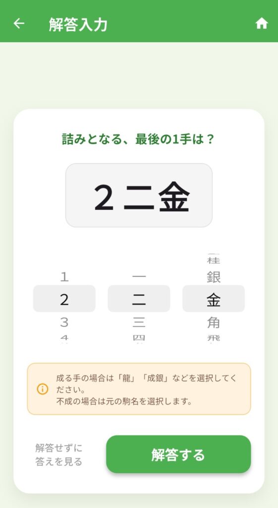 通常の詰将棋だと「2一飛車成り」が答えだとしても、本アプリでは「2一龍」のように、